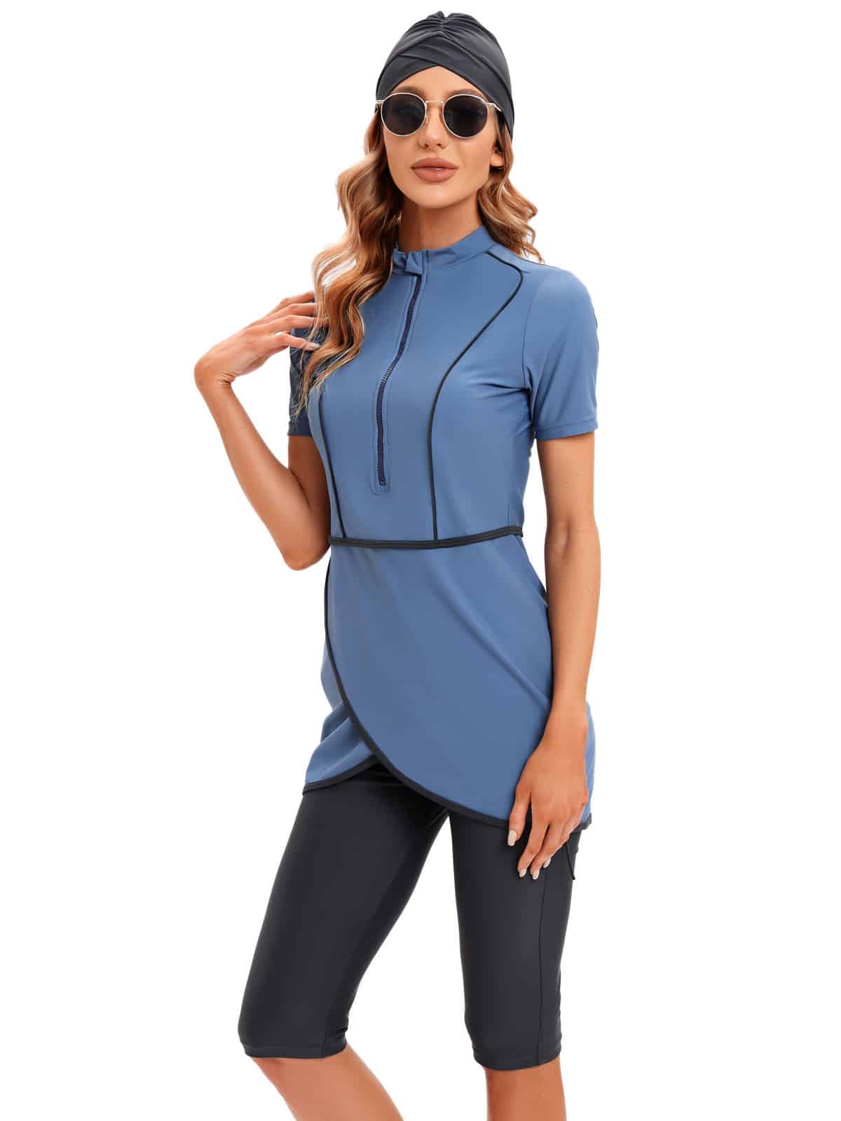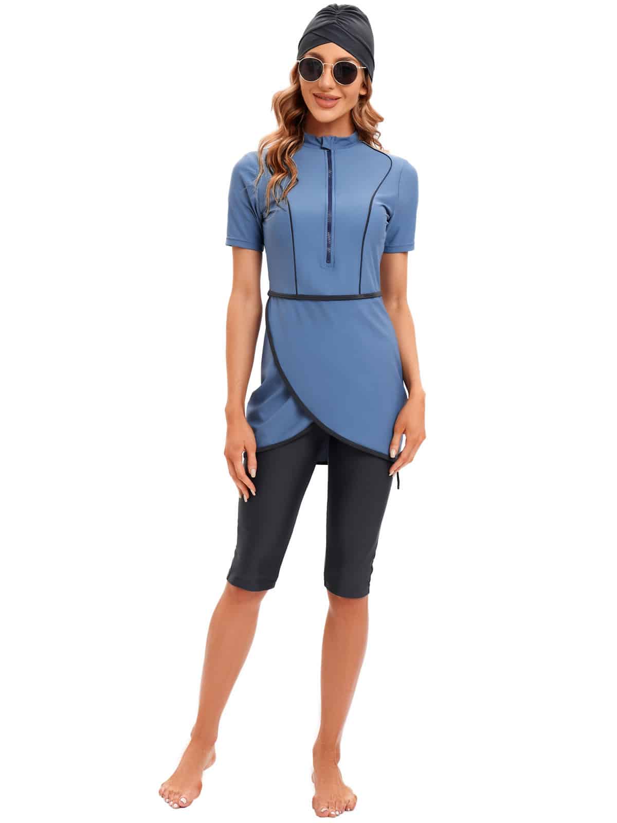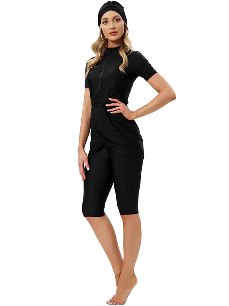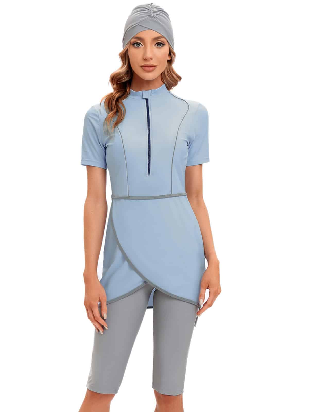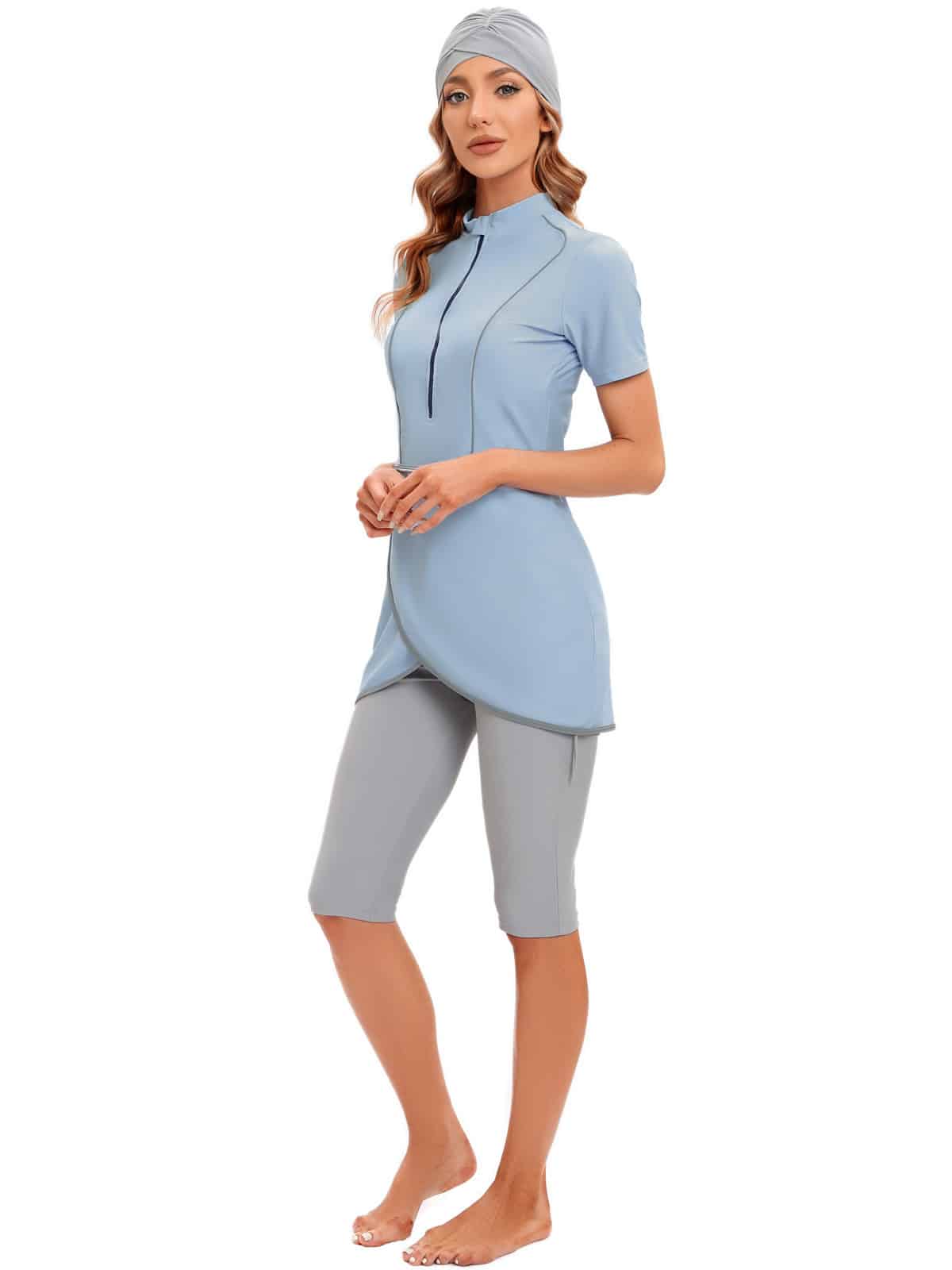 בגד ים שלם סגירת רוכסן שמלת מיני מעטפת עם טייץ עד הברך בשילוב כיסוי ראש תואם – חיה (משלוח חינם)
