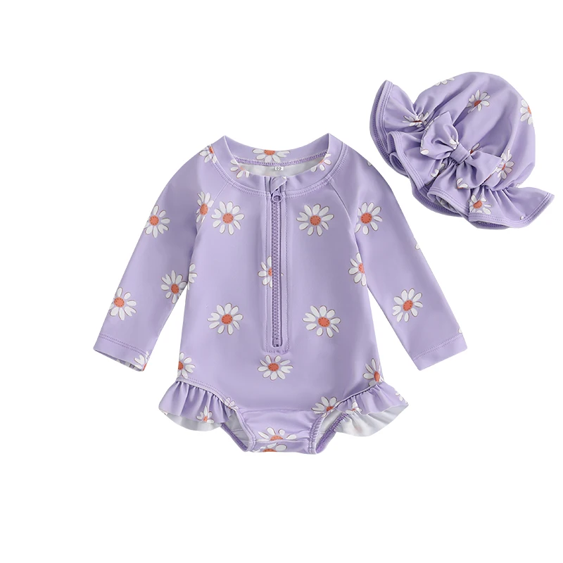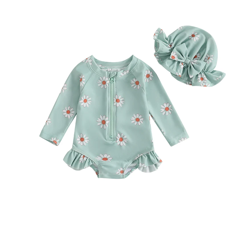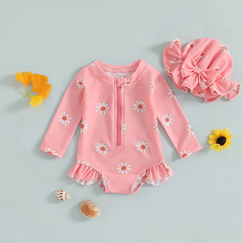 בגד ים תינוק תינוק פעוט מגן פרחים עם כובע סט רוכסן שרוול ארוך בגדי ים בגד ים בגד ים (משלוח חינם)