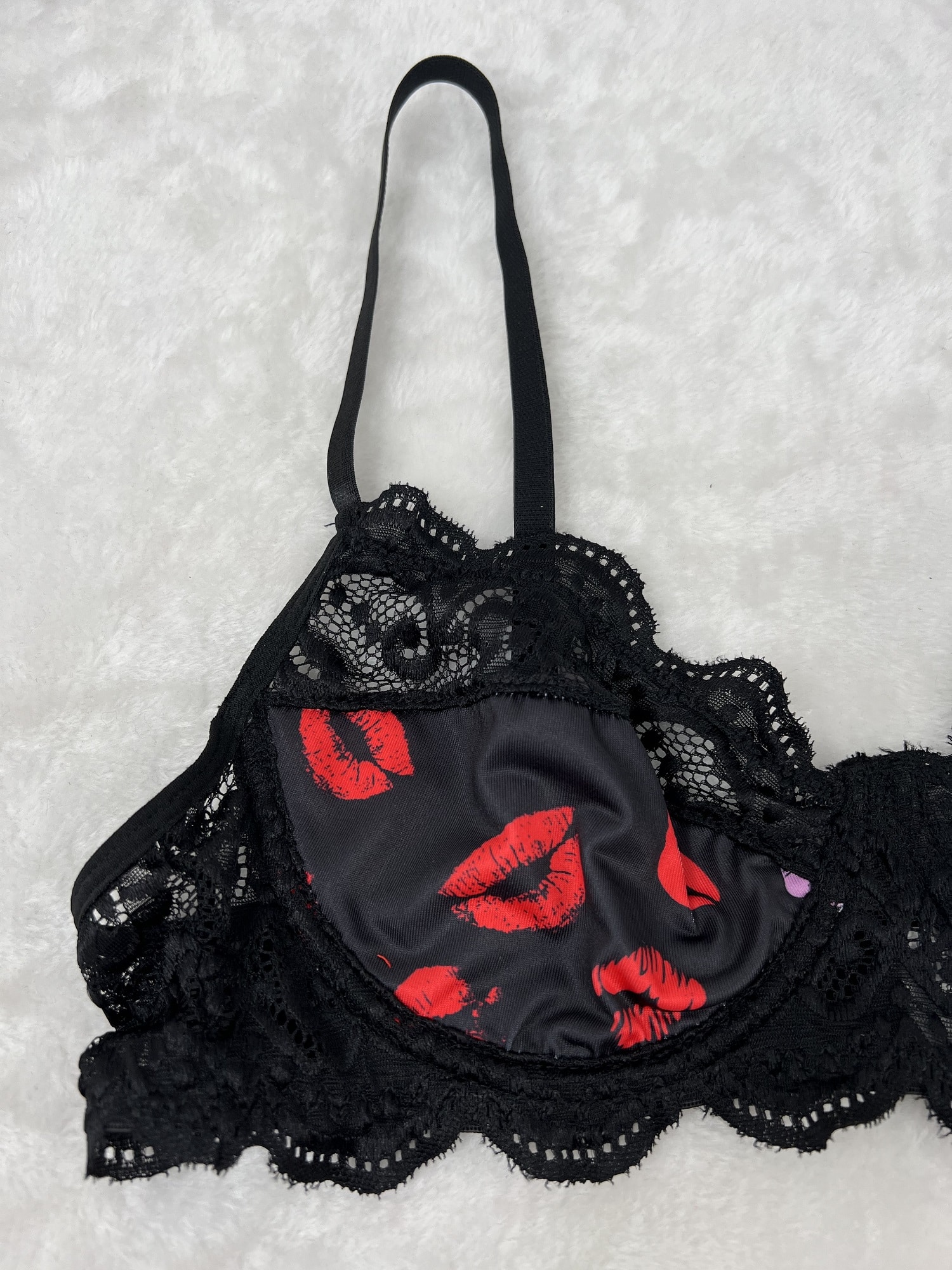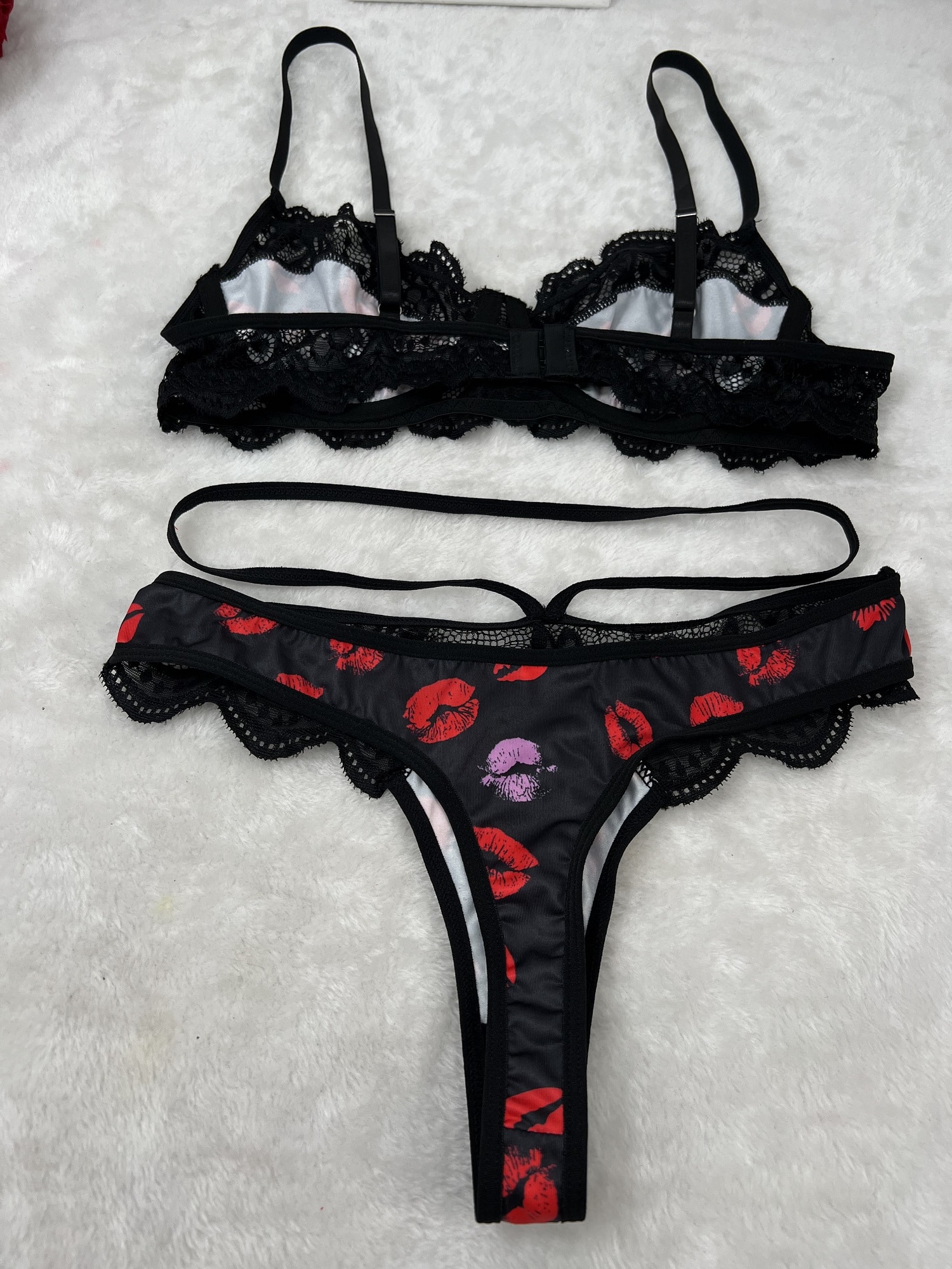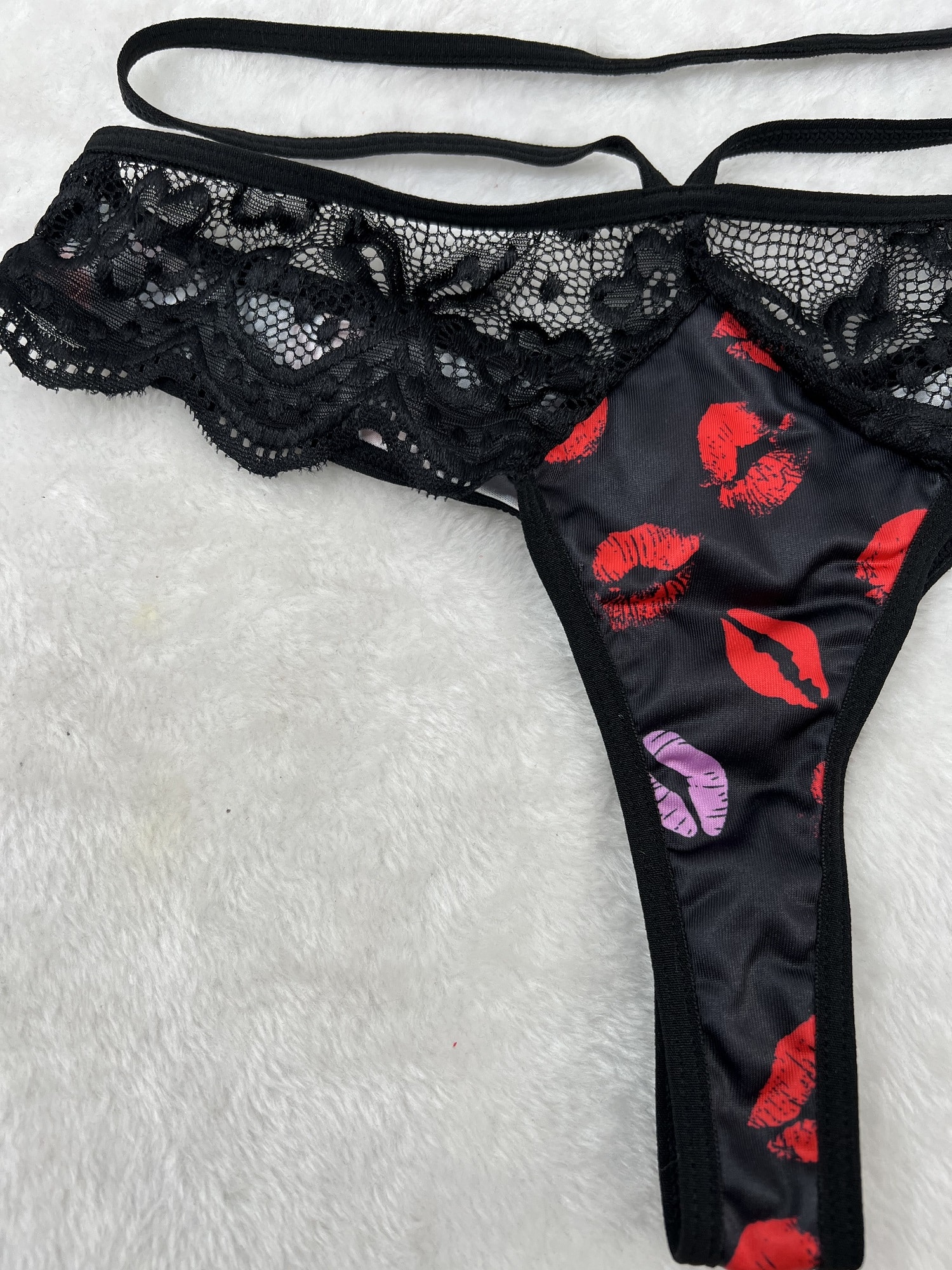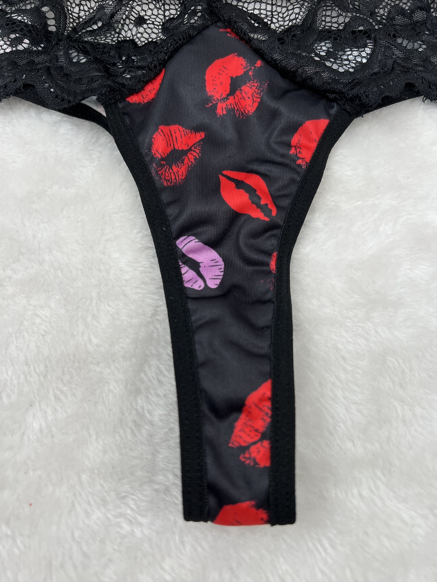 סט הלבשה תחתונה עם שוליים תחרה תחתון חוטיני עם הדפס נשיקות מתוקות