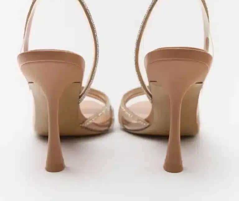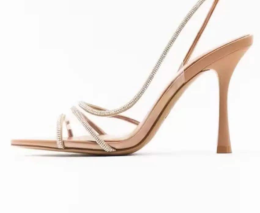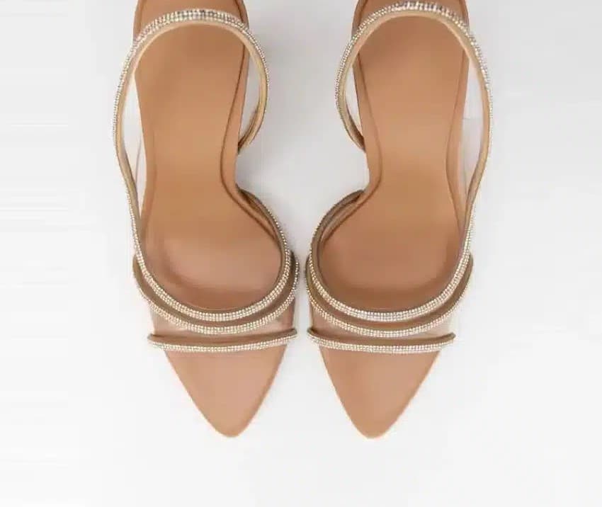 נעלי עקב סנדלי יוקרה. עם רצועות דקות שקופות בשיבוץ ריינסטון. מראה אירוע יוקרתי