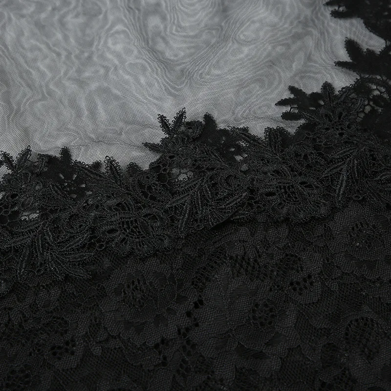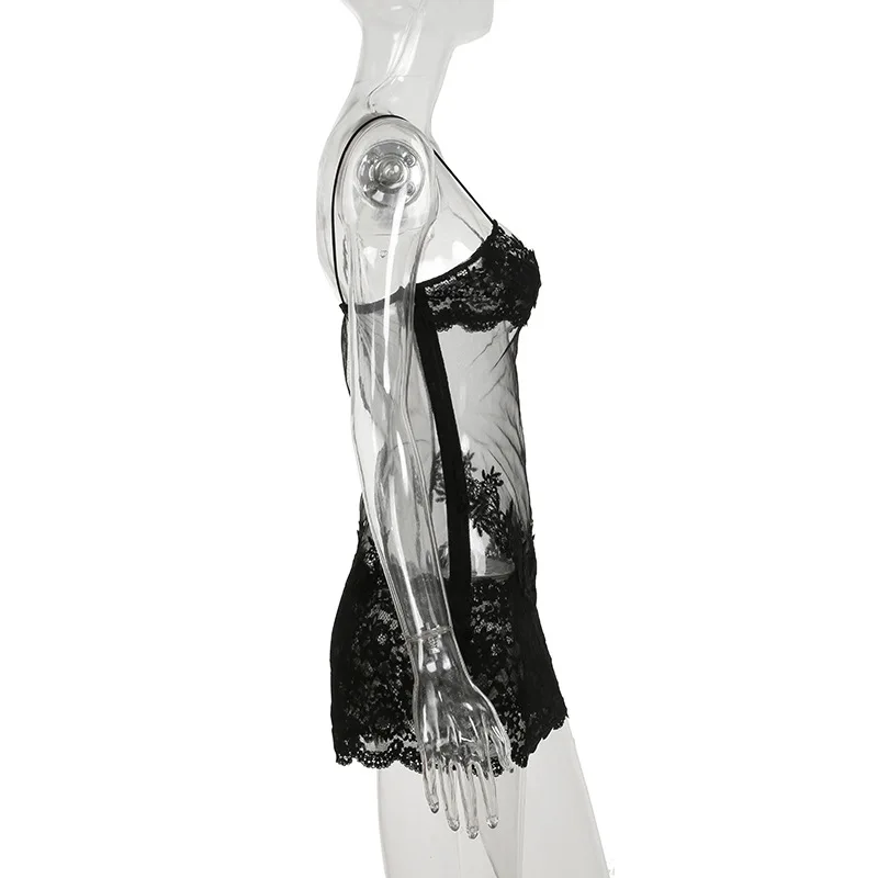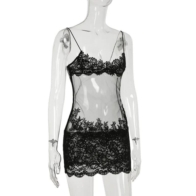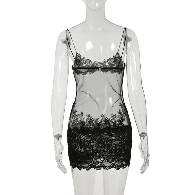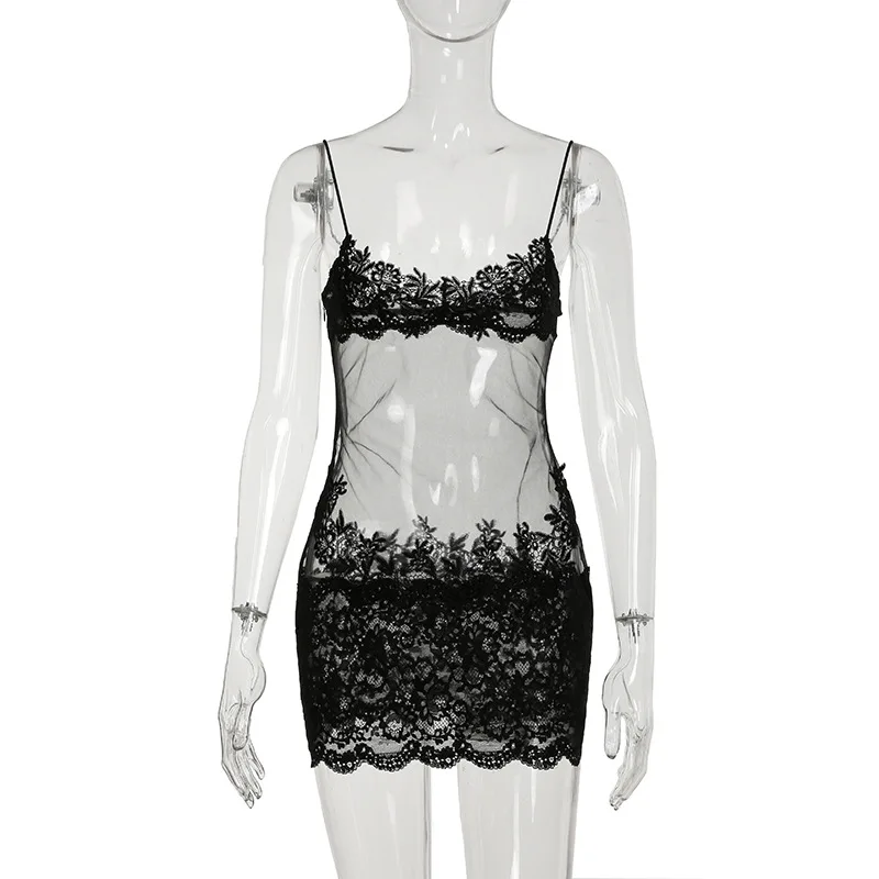 שמלת מיני שקופה משי סקסית עם רקמת ספגטי ופרחים, מתאימה למועדון ולשימוש בלילה (משלוח חינם)