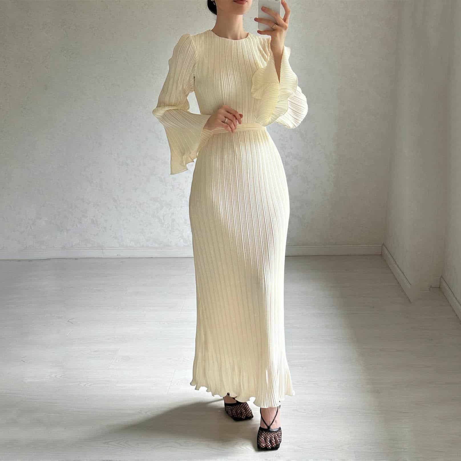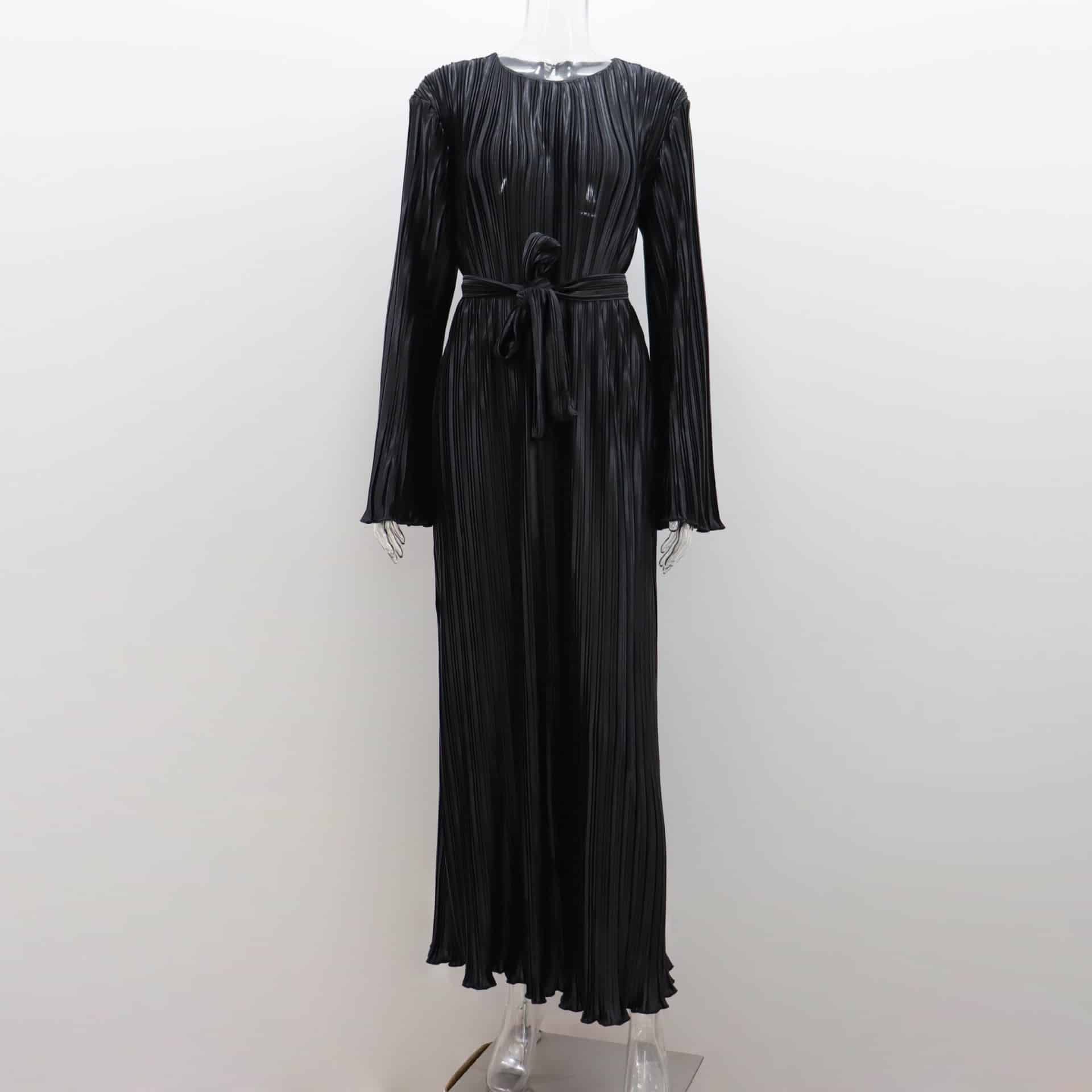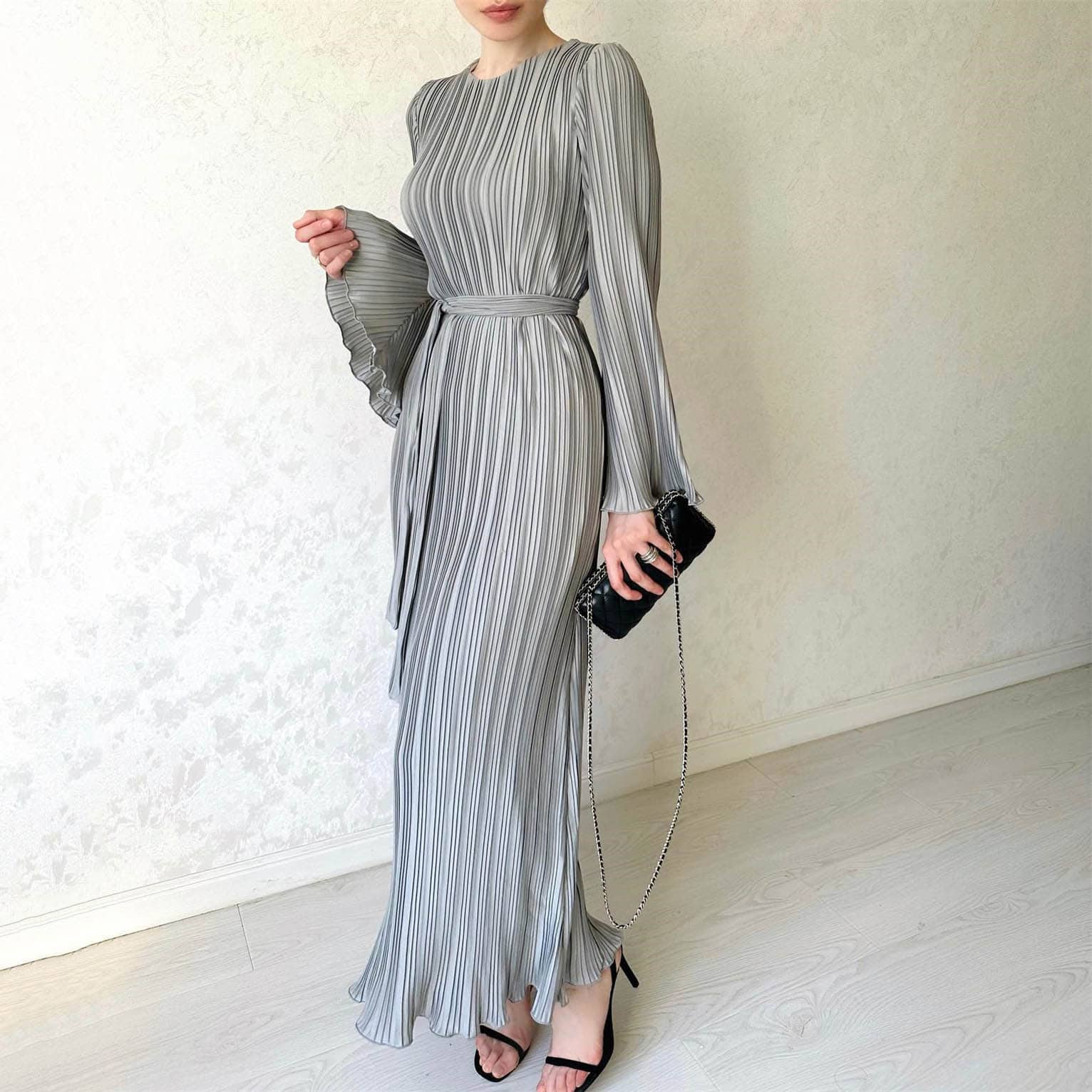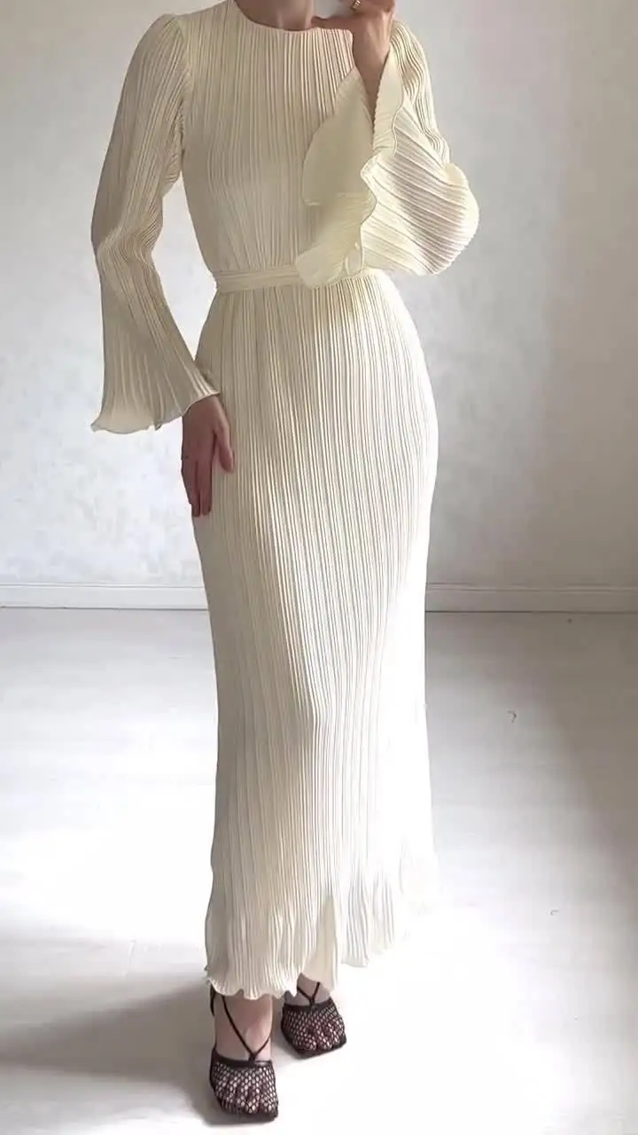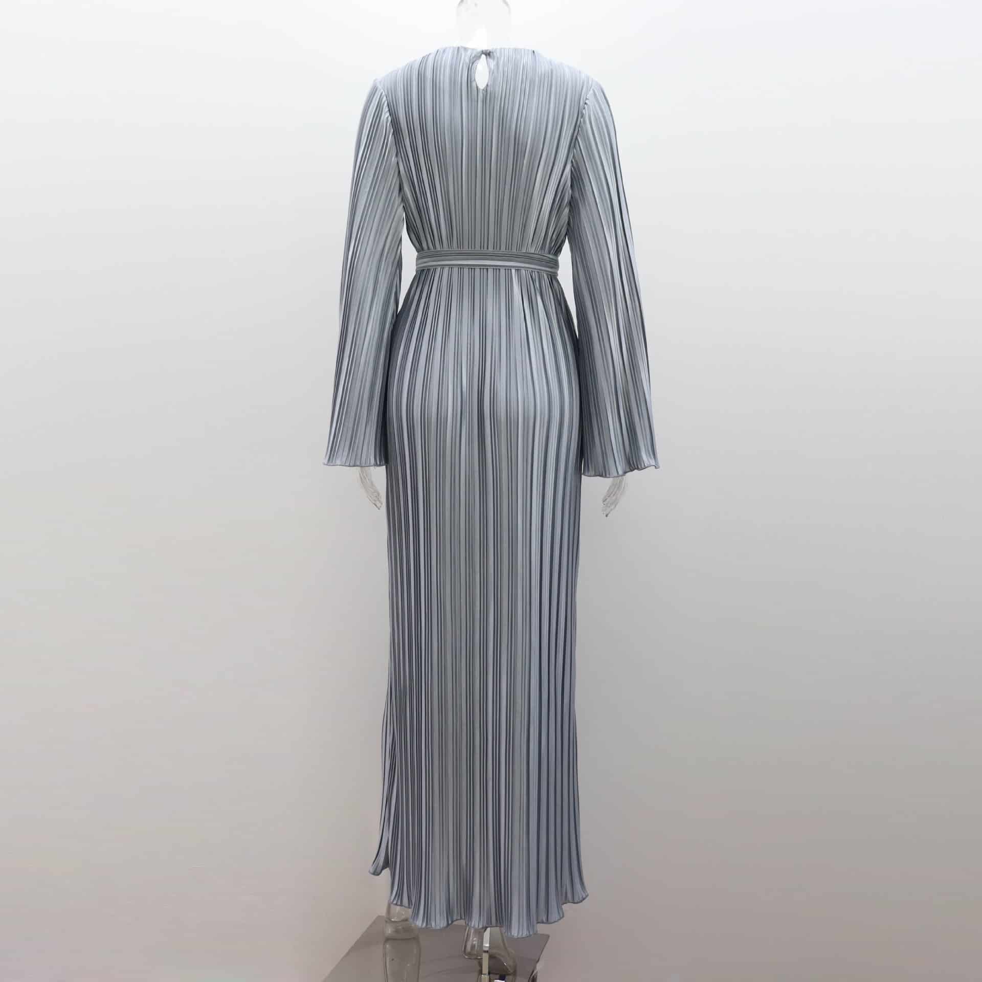 שמלת מקסי כיווצים בתוספת חגורת קשירה במותן שרוולי פעמון