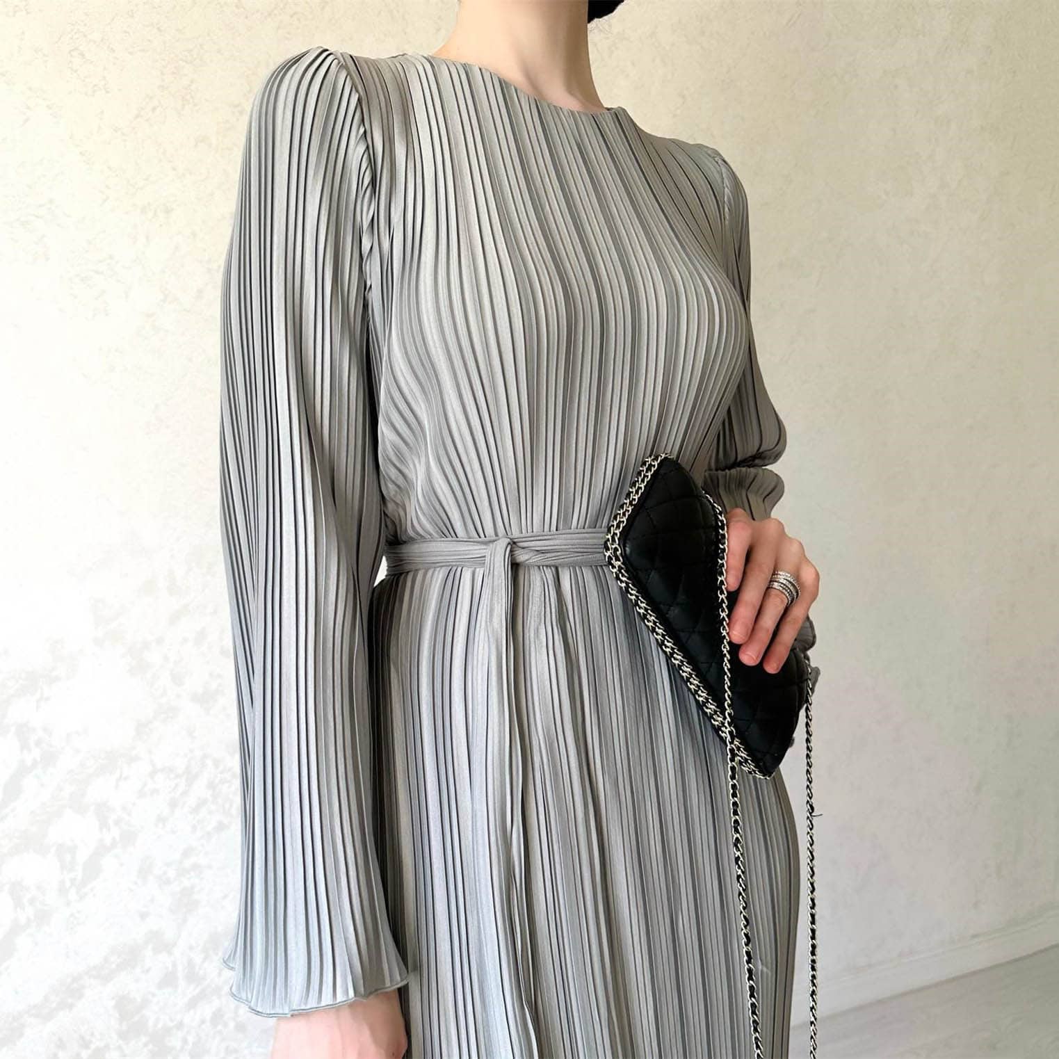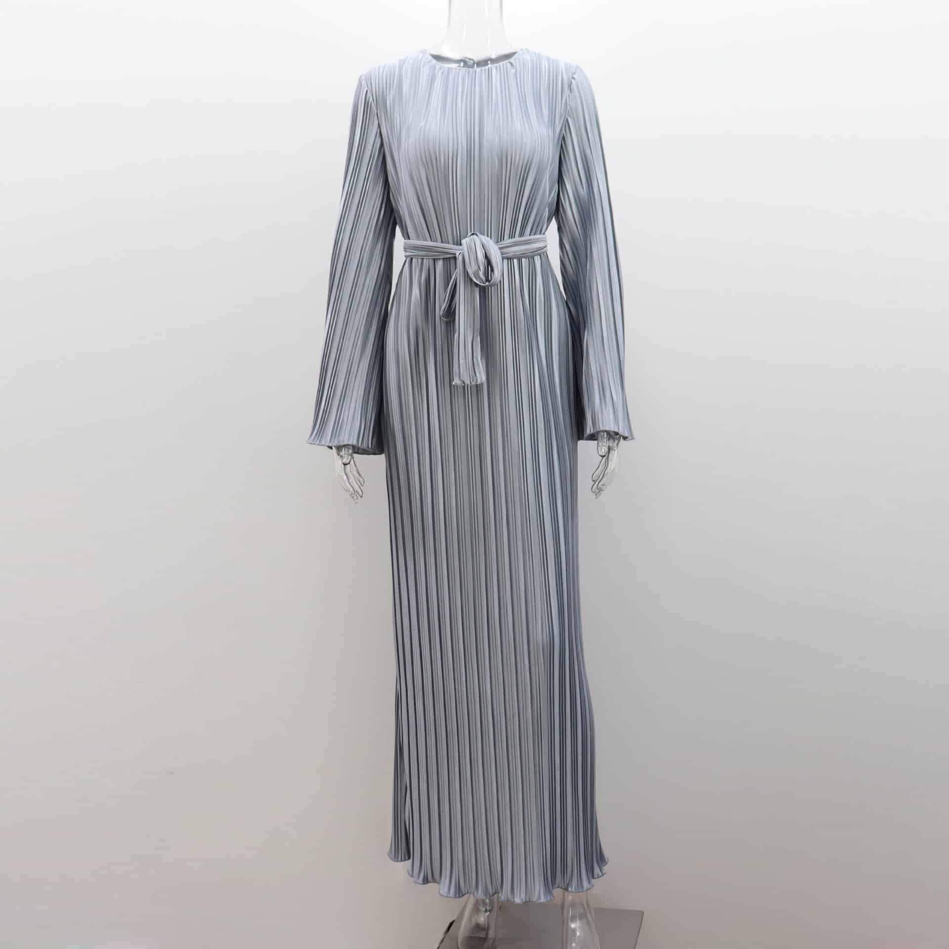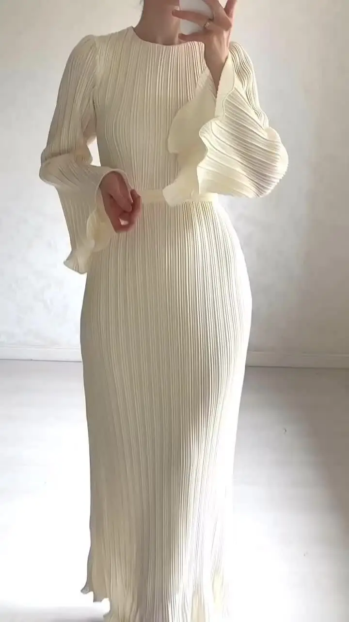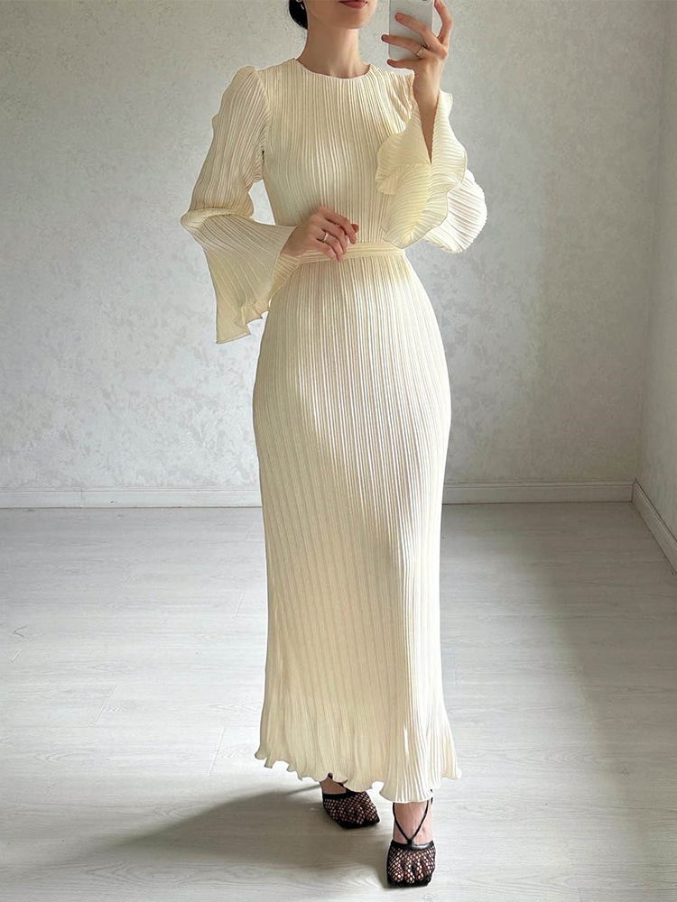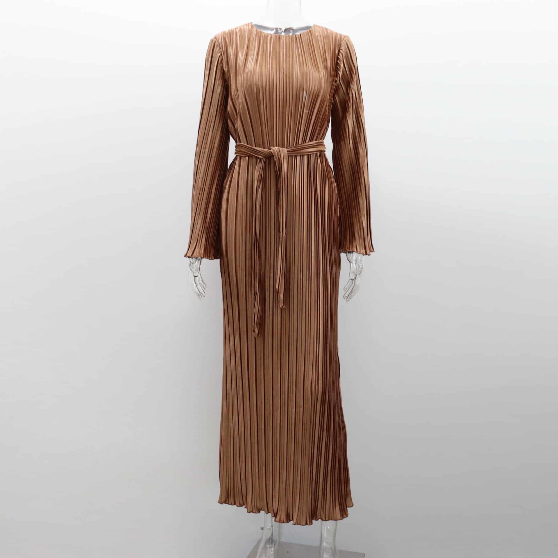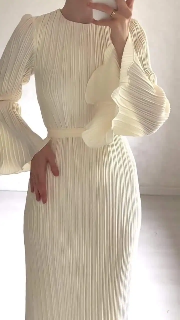 שמלת מקסי כיווצים בתוספת חגורת קשירה במותן שרוולי פעמון