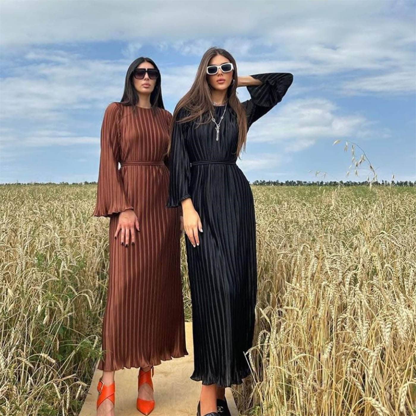 שמלת מקסי כיווצים בתוספת חגורת קשירה במותן שרוולי פעמון – נעמה (משלוח חינם)