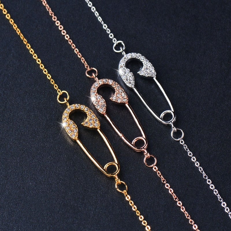 תכשיט טרנדי סט שרשרת צמיד סיכת ביטחון בשיבוץ קריסטל- קריסטל